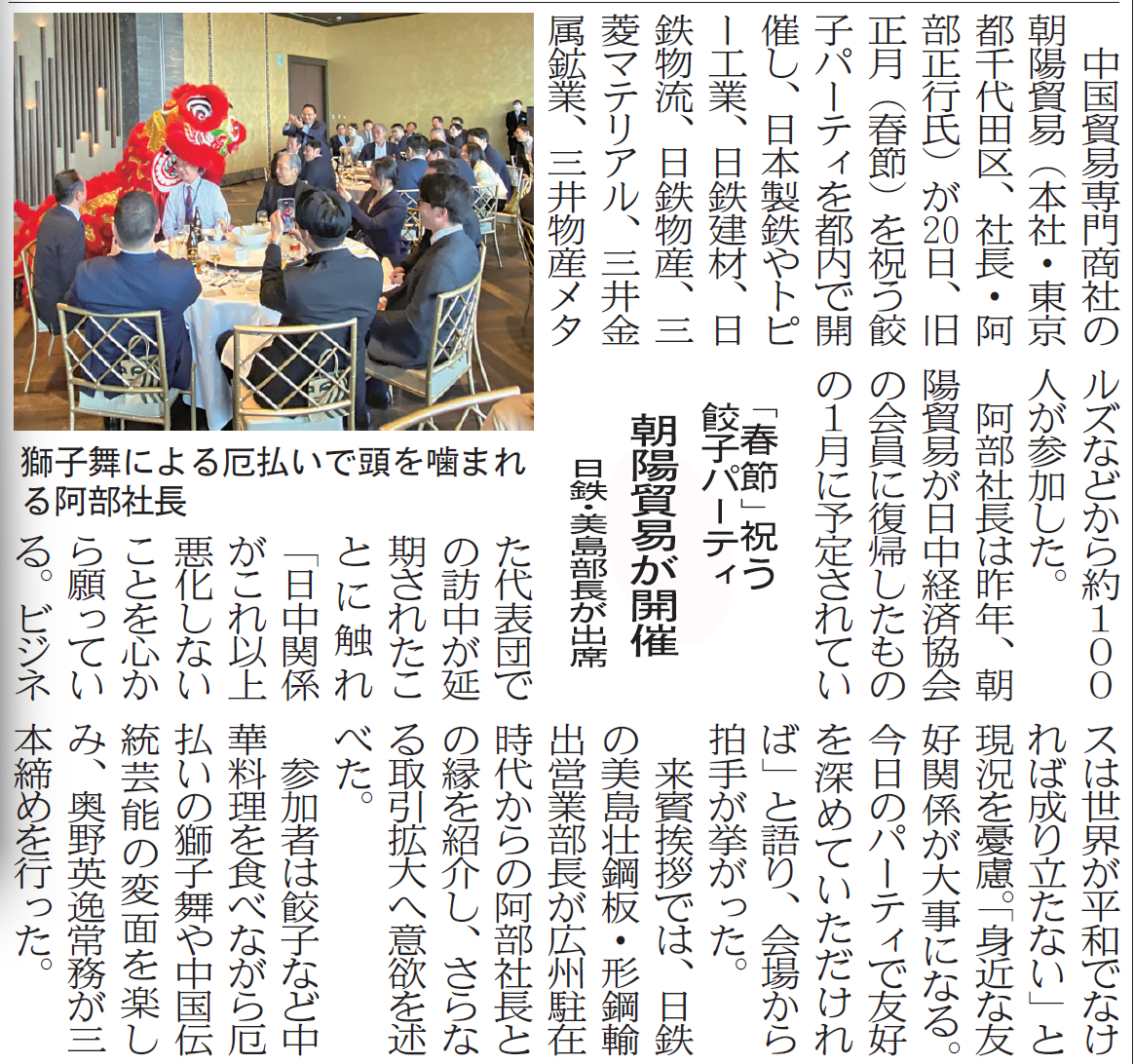 2026年朝陽貿易餃子パーティーを開催、鉄鋼新聞にパーティの様子が掲載された